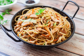 Smažené čínské nudle s kuřecím masem a zeleninou
