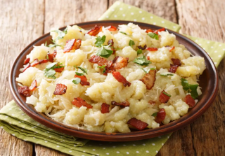 Staročeské bramborové placky s brynzou, restovanou slaninkou, cibulkou a česnekem