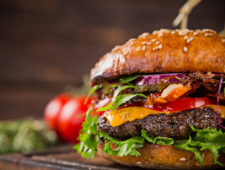 Hamburger ze 150g hovězího na crispy salátku, ovoněný slaninkou, chedar, karamelizovaná cibulka, rajčátko, okurčička, majonéza a barbecue omáčka