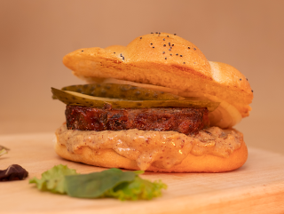 Sekaná s hořčicí, okurčičkou a cibulkou v křupavé houstičce