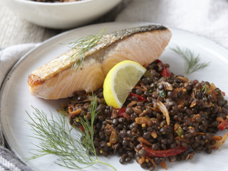 Losos na lůžku z černé čočky beluga s rukolou a tzatziky