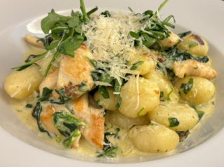 Bramborové noky s kuřecím masem ve smetanové omáčce sypané parmezánem a rukolou