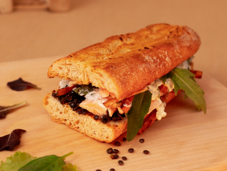 Sandwich s grilovaným lososem na lůžku z černé čočky beluga s rukolou a tzatziki
