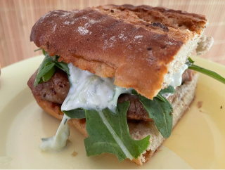 Sekaná, hořčice, rukola a tzatziki v křupavé houstičce
